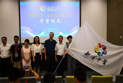 7月23日上午,“亲情中华”夏令营浙江舟山营在舟山育华国际学校举行开营仪式。来自美国的近40名华裔青少年和40名中方学生欢聚一堂,开始为期2周的中华文化之旅。
