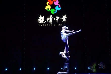 (中国杂技团演员表演杂技《芭蕾对手顶·邀月弄影》)