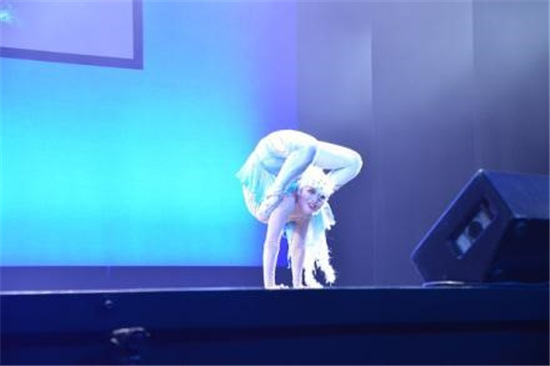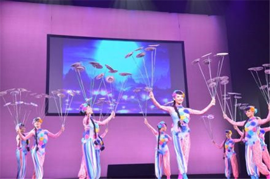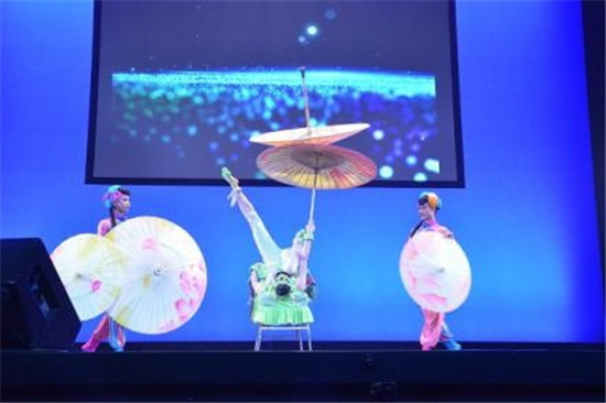 晚会以中国杂技团表演的精彩节目《转花碟》开场。满台生辉的转碟,营造出了“百尺游丝争树绕,一群娇鸟共鸣花”这一如诗如画的意境,“跑肩过头顶”等多个高难技巧组合和“牌楼转碟” 造型,更是让人赏心悦目。中国杂技团的年轻演员们可谓身怀绝技,其表演让人惊叹不已,《蹬伞》,时而侧飞,时而走边,时而大摆,飘逸中深藏几分沉稳。柔术节目《青狸》,演员将肢体的柔软与杂技的技巧巧妙结合,展现出“力”与“美”。《指尖流奏—拍球》用掷地反弹方式表演球技,同时掷耍9球让人眼花缭乱、击掌叫绝。
