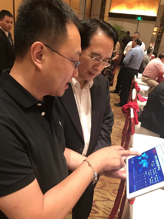 2018年陈思(左)向中央统战部副部长谭天星(右)汇报“互联网+繁荣中餐”项目