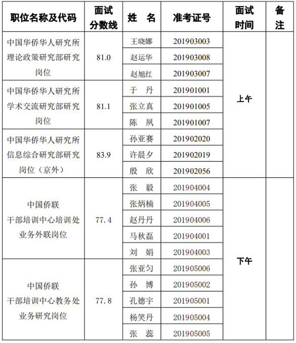 报考中国华侨华人研究所学术交流研究部研究岗位、信息综合研究部研究岗位(京外)、理论政策研究部研究岗位的考生进行面试。