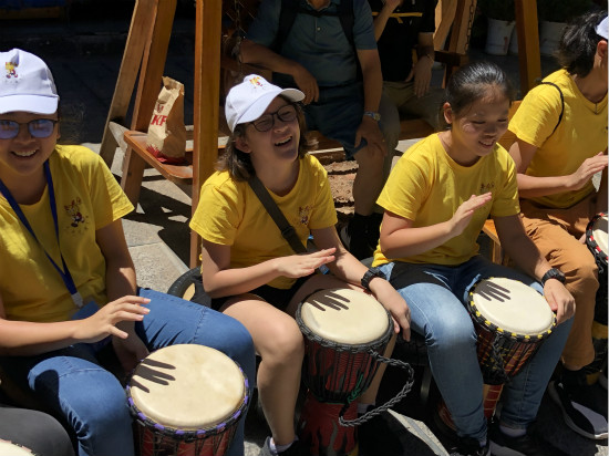 营员学习丽江手鼓,手鼓是丽江古城里的特色,而敲手鼓的孩子们,更是成为了丽江古城里一道美丽的风景线。