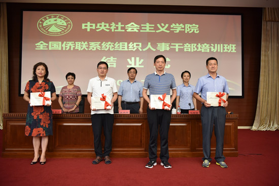 2019年7月26日,全国侨联系统组织人事干部培训班结业式在中央社会主义学院(中华文化学院)举行。中国侨联组织人事部部长、直属机关党委副书记兼干部培训中心主任姚林楠,组织人事部副部长赵珊珊,直属机关党委副书记、纪委书记林美龄出席结业式并颁发结业证书。来自30个省区市侨联,中央和国家机关侨联,中央企业侨联,中国侨联机关及事业单位的72名学员参加结业式。