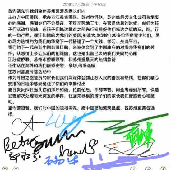 7月29日,一封来自苏州营营员家长们的集体签名信被送至夏令营承办方,字里行间,饱含深情……