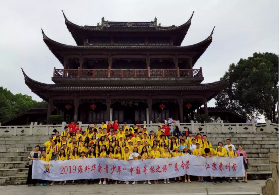 2019年“寻根之旅”夏令营—江苏苏州营闭营仪式上,107位来自美国、加拿大、德国、西班牙等国的华裔青少年台上台下真情互动,谐唱出悠扬曲调,“好一朵美丽的茉莉花,芬芳美丽满枝芽,又香又白人人夸……”