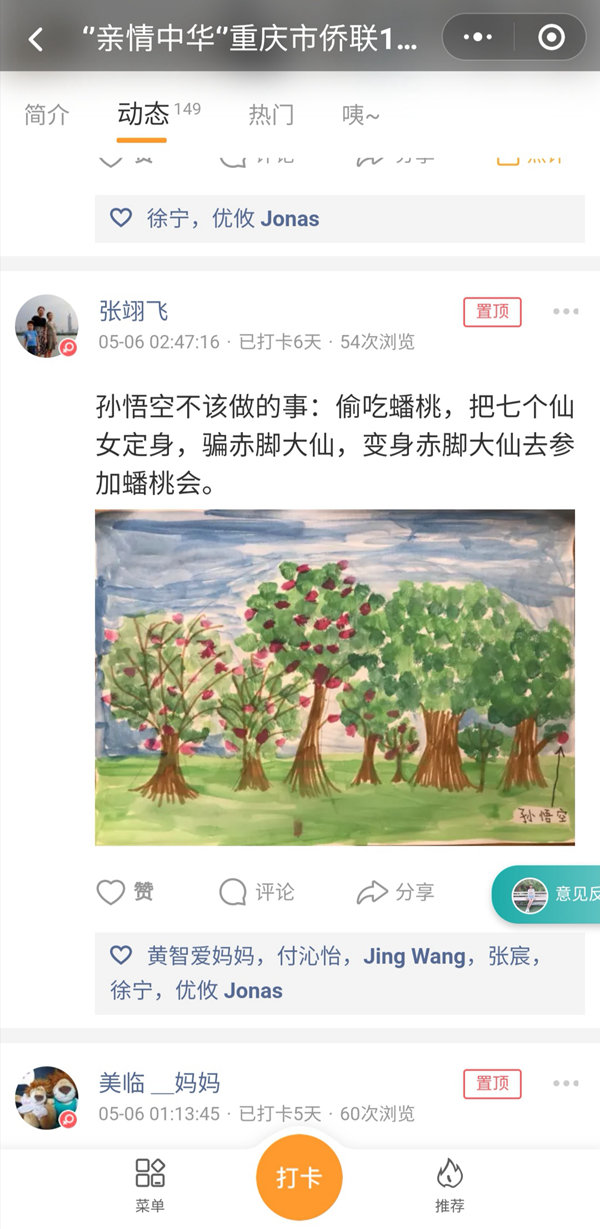 在已经过去的六天时间里,来自德国的58位华裔青少年,通过参加重庆市侨联搭建的网上夏令营1期微信群收听到了《西游记》中石猴出世、悟空学艺、金箍棒、大闹幽冥界、官封弼马温、掌管蟠桃园等6个故事,还学习了新冠病毒防疫知识、名人故事、成语故事等等。我们一起来看看学习的情况吧: