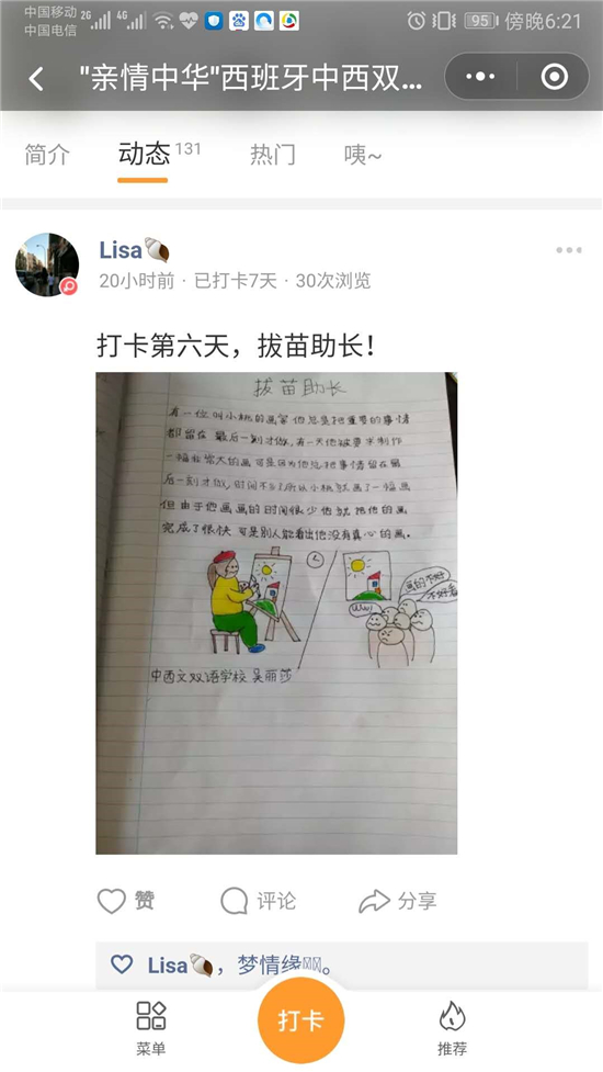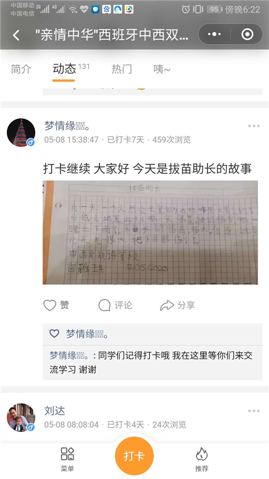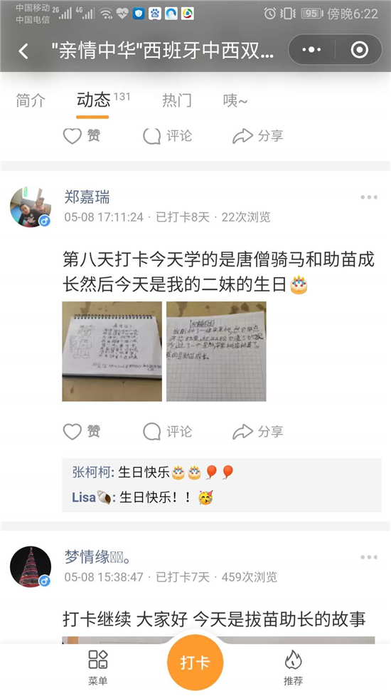 自4月30日“亲情中华·为你讲故事”网上夏令营广西营第一期开营以来,网上夏令营的学习正在如火如荼的进行中,来自西班牙中西双语学校的46位营员们每天坚持线上打卡、交流互动,听历史故事、学习中文诗词、获取抗疫知识。新颖、独特的网上授课方式让同学们深入了解了博大精深的中华文化,受到了海内外侨胞们的一致好评!