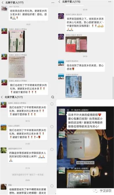 身处异国他乡,来自家乡的健康包让海外游子们特别暖心,一句“同心相依,守望相助,同气连枝,共盼春来!”的祝福语,饱含着“娘家人”对海外侨胞最温暖的关心和牵挂。“谢谢关心,远在万里之外的加拿大宁夏籍侨胞和留学生,在这个特殊的时刻,收到的不仅仅是口罩,还有来自祖国对海外侨胞的关怀,这关怀和感动将永远留在我们心里!谢谢!”加拿大中国宁夏协会转达了侨胞和留学生们对宁夏侨联的谢意。美国、意大利等地侨胞和留学生们也陆续收到了爱心包,并通过转发朋友圈、写下感谢的话语,表达了对祖国和家乡侨联的感激之情。