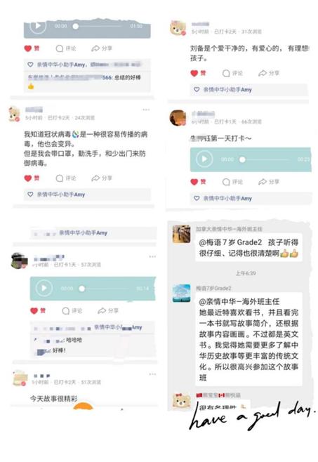 本次网上夏令营为期15天(5月15日-5月29日),学习内容涵盖古典名著、成语寓言、历史名人、人文地理、防疫知识等。营员听故事后在小程序里打卡,并在微信群互动展示。网上夏令营推出的每个小故事都会配备小任务,有的小任务需要营员用手机录制视频,有的小任务需要营员在打卡小程序中写下文字。除营员录制小任务视频外,还可以轮流做语音分享,围绕故事主题进行辩论或讨论,对故事进行改编或续编等,使微信群成为营员们互动和展示的空间。