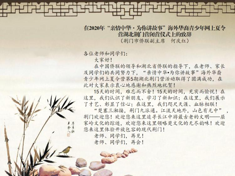 荆门市侨联副主席何庆红在2020年“亲情中华·为你讲故事”网上夏令营湖北荆门营闭营仪式上的致辞