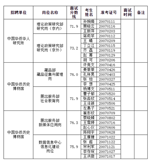 中国华侨历史博物馆研究与交流部华侨史/博物馆学研究岗、藏品部藏品征集与管理岗进行面试。