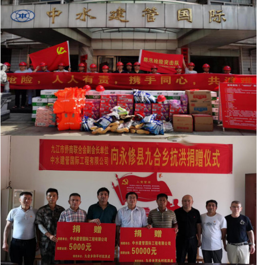 各级侨联组织、涉侨社团联合广大侨界群众,立刻投入防汛救灾工作。九江市侨联、侨商会,九江市侨联常委、江西省国泰科技有限公司,庐山市侨资企业九江市帝盛酒店管理有限公司,瑞昌市侨资企业九江市厚华科技有限公司,濂溪区侨联等各侨界人士,均自发赶往防汛一线,慰问坚守在一线的防汛干部与官兵,并带去苏打水、红牛、鲜肉包子、西瓜以及风油精、内裤、袜子、西瓜、矿泉水、方便面、八宝粥等物资。九江市侨商会副会长单位中水建管国际工程有限公司召集水利专业人员组成市侨联志愿者服务队,奔赴洪涝重灾区永修县九合乡九合联圩,参与到抗洪一线,并带去了3万余元防汛物资。