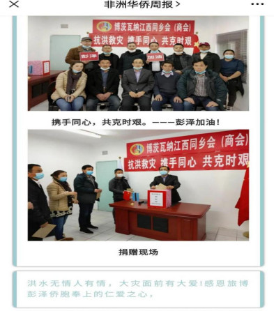 博茨瓦纳彭泽籍侨胞在微信群发起倡议、接龙捐款,虽然自身还处在新冠肺炎疫情频发期,还处于复工自救状态,依然积极为家乡抗洪救灾捐款20余万元普拉(折合人民币12万元)。博茨瓦纳华人华侨总商会副会长李刚向九江市统一战线基金捐赠10万元人民币,向彭泽县统一战线捐赠资金6万元。