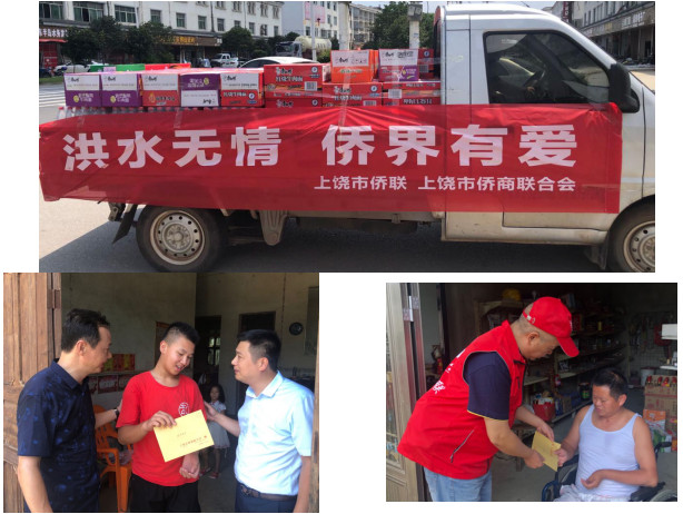 环鄱阳湖区的鄱阳县、余干县、万年县受灾情况最为严重, 7月20日,上饶市侨联协同上饶市侨商联合会带头捐款捐物,带着归侨侨胞和侨商侨企的深情厚意前往余干县开展了以“洪水无情,侨商有爱”为主题的走访慰问活动。慰问组首先前往松霞源村和枫塘村对受灾贫困户进行了走访慰问。深入受灾贫困户家中,实地了解受灾情况和生产生活情况,随后来到了位于古埠镇五福村的防汛指挥部,与当地村干部展开了座谈,并送上了由市侨商会提供的慰问金、慰问品以及抗洪救灾物资。市侨联在充分发挥“凝聚侨心、汇聚侨力、发挥侨智”作用的情况下,作为爱心传递使者,把广大侨商侨企的一片爱心第一时间传递到了灾区。