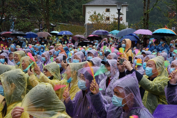 “太阳出来啰喂,喜洋洋啰啷啰……”嘹亮的歌声在渝东的崇山峻岭之间久久回荡,唱不尽人们的喜悦。在“亲情中华·欢聚石柱”文艺演出现场,虽然天空飘着蒙蒙细雨,但是台上的艺术家和台下的老百姓热情高涨。他们相互应和,共同唱起《太阳出来喜洋洋》这段耳熟能详的渝东民歌,抒发着对幸福生活的由衷赞美。
