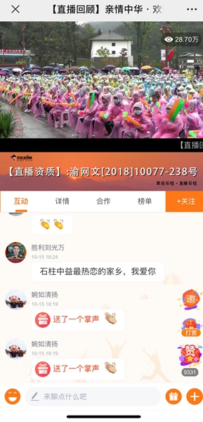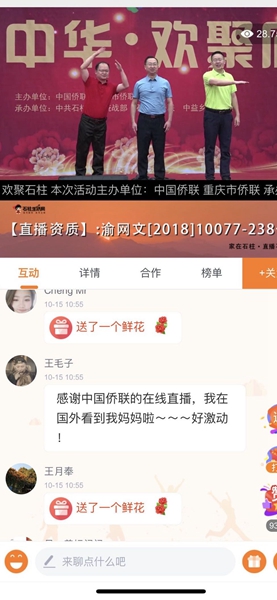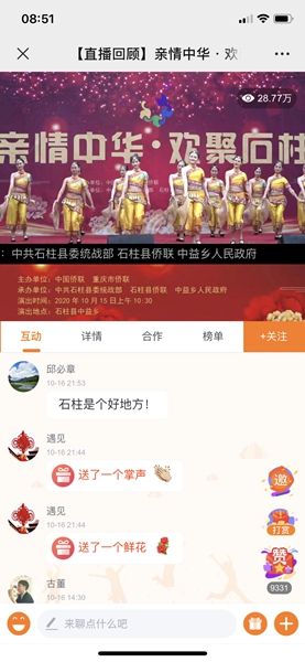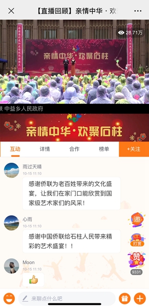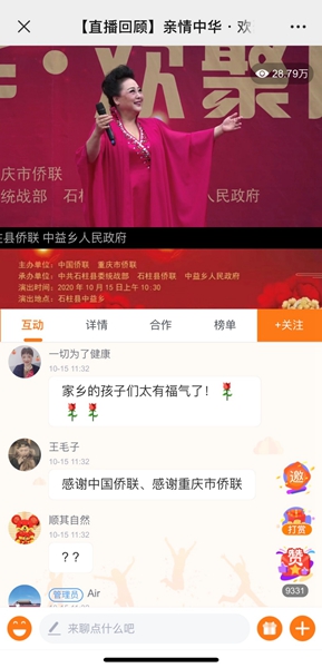 “感谢侨联为老百姓带来的文化盛宴!”“家乡的老百姓太有福气了!”“规格高、效果好、意义重大!”……除了现场观众一片叫好,15日的演出还在石柱生活网全程直播,吸引28.71万人次的观看量,网友刷屏点赞,其中不乏石柱籍的海外侨胞。