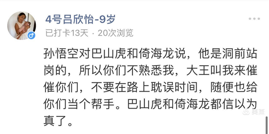 秋令营期间,营员们参加了丰富多彩的学习活动,每天通过推送故事、任务打卡、成果展示、讨论辩论、改编或续编故事等方式,学习名著故事、体验风土人情、了解传统文化。