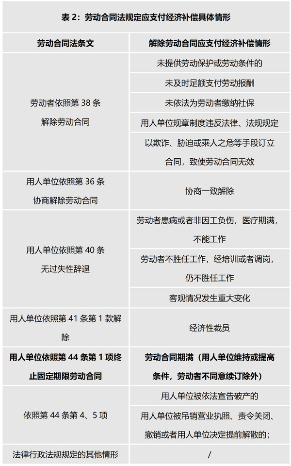 2008年1月1日《劳动合同法》颁布实施,其中第四十六条规定,在如下表所示的情形下,用人单位应当向劳动者支付经济补偿。