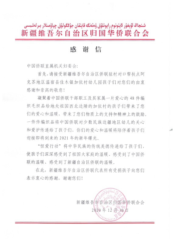 加依村幼儿园和新疆自治区侨联向中国侨联直属机关妇委会发来感谢信,代表接受捐赠的孩子们表示感谢。