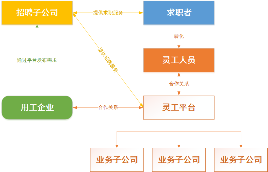 又如某灵活用工平台,其专门下设一子公司从事灵活用工招聘业务,基于平台用工企业的要求招聘合适的灵活用工人员,后由该灵工人员与平台自身或集团内其他关联公司建立合作关系。具体如下图所示: