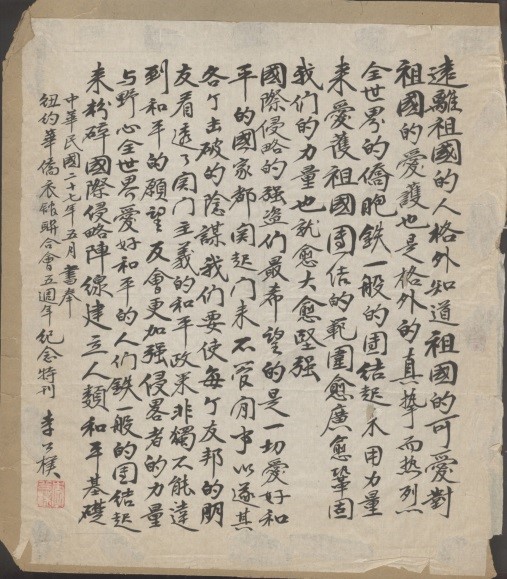 纽约衣馆联合会诸先生鉴:久仰。硕望时切怀想。近以祖国抗战之烽火正炽,而国际侵略之风云旋紧,处此惊疑震撼之秋,对于海外耆贤弥深眷顾之念,鄙人等仅代表敝军向诸先生致以深切之慰问,并将国内外形式略微报告,尚希垂察焉。溯自我国抗战三载以来,日寇势力已日渐削弱,其国内之困难以日渐增长,近则正如强弩之末,只须我国加强团结坚持抗战,则最后胜利之来临当在不远。......敌后进击猛烈开展,正面反攻亦经取得局部之胜利,即证以敝军及新世军在冀、绥、察、热、山东、山西以及苏、皖、浙一带三载于兹,迭经收复广大沦陷区,建立巩固之战日根据地,并不断予日寇以猛痛之打击。......敝军及新四军站于国防之最前线抵御敌人十七个师团而未尝后退一步,卒能保卫西北,屏障中原,猛烈展开敌后游击战争。此固由于全体将士有高度之革命热情与极强之民族自信心,然亦由于国内外同胞多方指导与协助,有此敬之。今后仍当一本初心,在蒋委员长之正确领导与各侨胞之支持督促下,在各友军及全国抗日人民之精诚团结下,为实现三民主义新中国而奋斗到底。夙仰诸先生,华侨表率、爱护祖国,素具热诚。尚希南针时赐,俾得遵循有赖,共求民族解放伟业之彻底完成。此则不仅敝军之幸,抑亦国家民族之利也!谨此布达。伫候明教,临颖不胜,迫切企盼之至。并致民族解放敬礼!