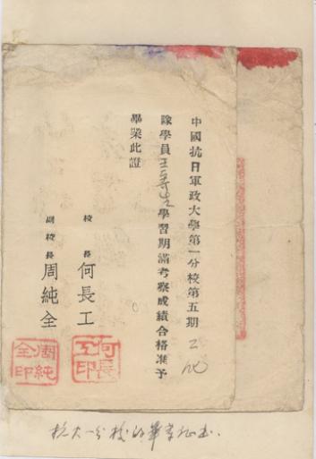 白刃(王寄生)的抗日军政大学第一分校毕业证书