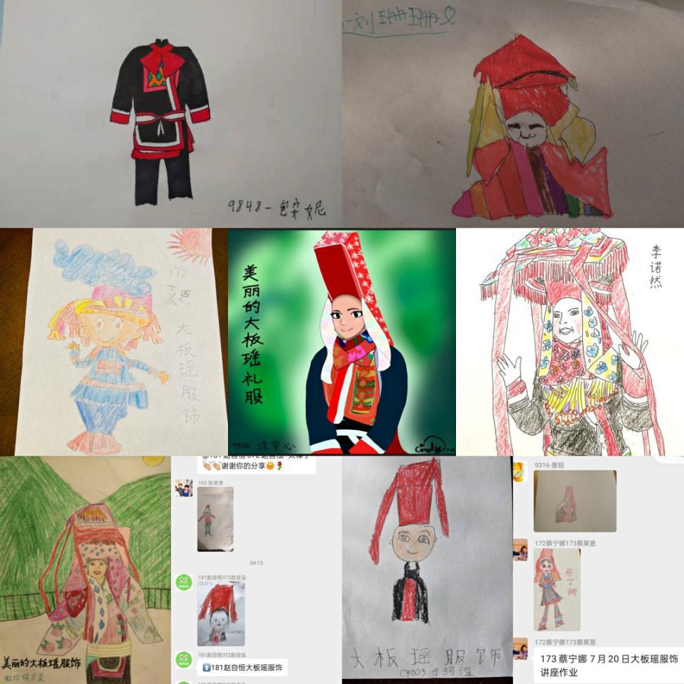 大板瑶服饰是居住在中越边境地区瑶族妇女的日常服饰。它以大红威仪为美,用黑色或蓝黑色棉布作底,再配以色彩斑斓的刺绣花边图案。大板瑶最有特色的就是戴在头上的“高帽”,由一层层红布板磊叠起来,高度和花边层数越高、越多越好,最高达120层,最少也有8层。营员们看了大板瑶奇特的服饰,觉得大板瑶服饰虽然复杂,但非常漂亮,纷纷忍不住动手画了起来。看看他们的作品,是不是特别可爱呢?