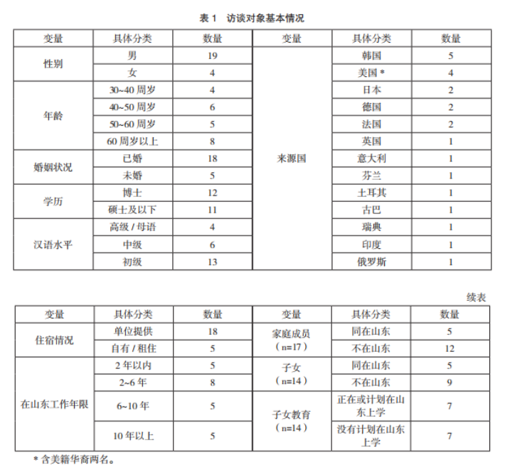 作为全国经济较为发达的省份之一,长期在山东工作的外国人约有1.5 万人,其中外国高层次人才占比为12% 左右,这一数量位居全国前列,但落后于上海、广东、北京、浙江、江苏等省市。山东省的另一个特点是各地市发展相对均衡,既有内陆城市,也有沿海城市;既有人口稠密的大都市,也有人口适中的小城市。山东省的这些特点为访谈提供了良好的基础,也使得研究结果在全国层面具有较好的借鉴意义。