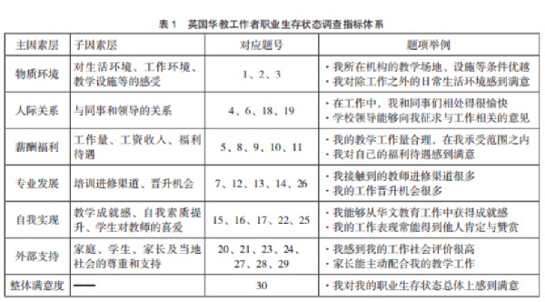 关于华文教育工作者职业生存状态的研究路向及内涵,现有的研究主要包括:第一,单维度取向,即仅仅关注中文教师物质方面的薪酬待遇问题,或者仅关注专业发展问题;第二,双维度取向,即不但关注物质维度的问题,还同时关注中文教师的情感体验方面的问题,如职业倦怠、教学效能感、身份认同等等;第三,多维度取向,即关注华文教育从业者的薪酬待遇、专业发展、情感体验、身心状态等多个方面。鉴于对华文教育工作者职业生存状态复杂性的认识日益加深,多维度研究逐渐成为主流,故本研究采取这一研究路向。