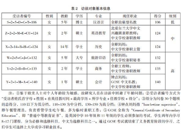 研究人员于2019年底至2020年初陆续对受访者进行面对面访谈和微信语音访谈,重点了解英国华教工作者在六个维度上的感受,以及从教动机、对英国华文教育未来发展的看法、个人继续从教意愿以及职业发展规划等。每次访谈时间为45~90分钟,访谈内容后被整理为3 万多的文字资料。