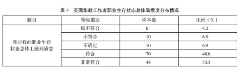 第30 题单构面测量的总体职业生存状态满意度均值为4.05,接近最高值5,具体分布情况如表4所示:选择“非常符合”和“符合”的人共占81.9%,有6.9%的人表现出“不确定”的摇摆状态,而选择“极不符合”和“不符合”的人共占11.1%。绝大多数英国华教工作者职业生存状态自我感觉良好,满意程度较高,这为英国华文教育的开展提供了坚实的心理基础。