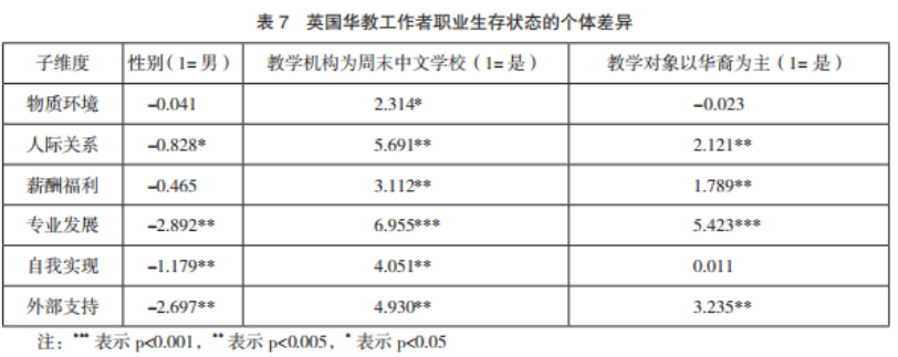 经过均值比较发现,英国华教工作者的职业生存状态主要在性别、任教机构和教学对象等方面存在显著性差异(P<0.05),如表7所示:第一,男性从业者各维度的职业生存状态的得分均低于女性,且“人际关系”“专业发展”“自我实现”与“外部支持”子维度在性别方面差异显著;第二,不同任教机构和教学对象的从业者存在显著差异,就职于周末中文学校的从业者在各维度的职业生存状态得分都高于在其他机构工作的同行;第三,以华裔学生 为主要教学对象的从业者在“人际关系”“薪酬福利”“专业发展”“外部支持”子维度的得分要明显高于以非华裔为主要教学对象的从业者。