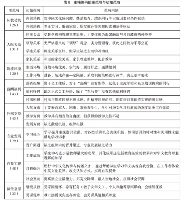 确定初始范畴之后,研究人员根据主轴编码原则对21个初始范畴的相互关系和逻辑次序进行梳理,得出“从教动机”“人际关系”等8个主范畴,详见表8,括号中为自由节点数。