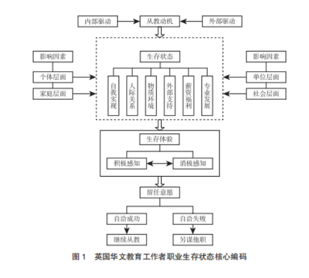 此“故事线”可以概括为:英国的华教工作者最初受到内部和外部的多种因素驱动决定从教,在他们进入华文教育职场后,来自个体、家庭、单位和社会四个层面的影响贯穿其职业生涯,决定着他们在华教职场的职业生存状态,继而影响其职业生存体验,其中既有积极感知(如物质环境优渥、人际关系和谐、传承中华文化的自豪感、学生进步的成就感等),也有消极感知(如待遇低下、身份模糊、前途迷茫等),并且两种相互矛盾的感知一直处于此消彼长变动不居的状态,当他们能够逻辑自洽成功时,会选择继续从教,否则就可能会离开华教职场,另谋他职。
