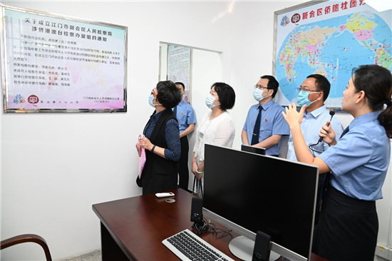 10月12日,调研组实地调研江门新会区检察院检侨联络站,详细了解该站点运行情况、服务案例、创新模式和“检侨·360”等为侨服务工作品牌,并召开座谈会。会上,检侨联络站与巴西广东同乡会副会长进行视频连线,听取海外侨领意见建议。江门市检察院、江门市侨联、新会区检察院分别就检侨合作情况进行汇报,与会人员也就加强检侨合作,有效推进为侨服务进行了深入探讨交流。