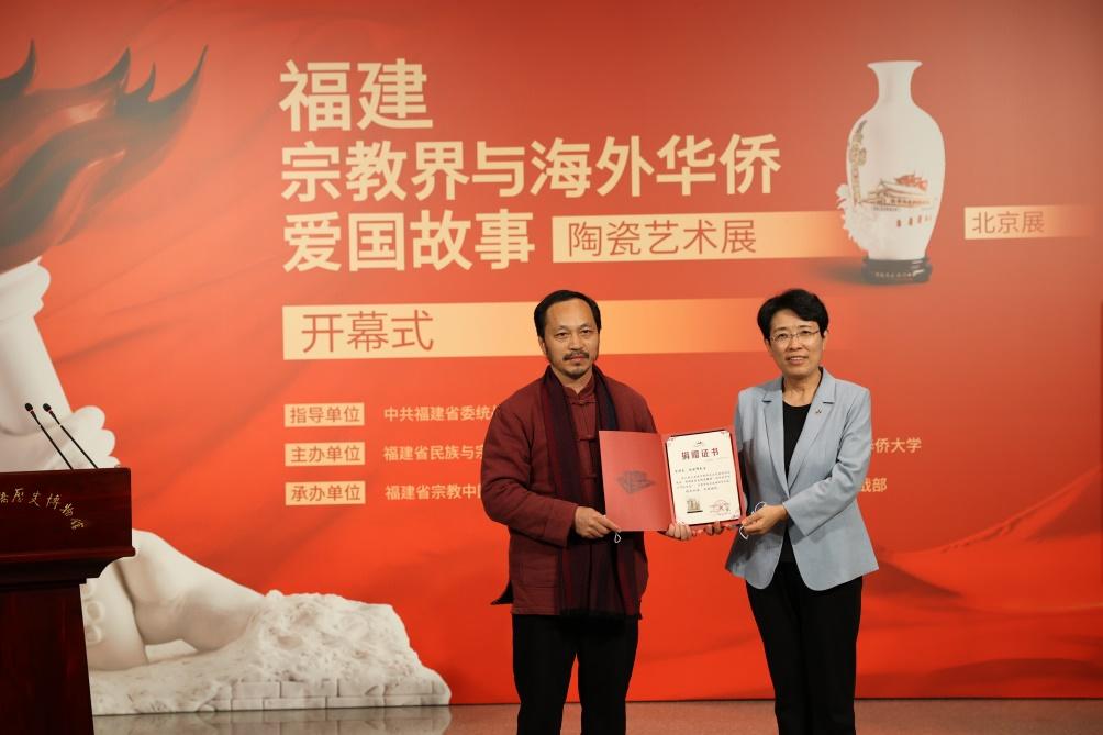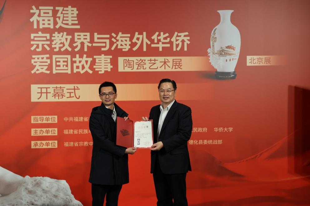 隋军、程学源向捐赠人、中国陶瓷艺术大师陈明良,捐赠人、福建省陶瓷艺术大师郑建忠的代表颁发中国华侨历史博物馆捐赠证书。