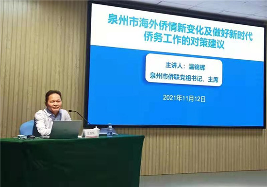 为深入贯彻落实习近平总书记关于侨务工作重要论述和指示批示精神,巩固侨联系统干部党史学习教育成果,切实提升侨联干部能力素质,2021年11月11-15日,由泉州市侨联主办,惠安县、南安市侨联协办,华侨大学继续教育学院承办的泉州市侨联干部“学党史侨史 知侨情侨务”专题培训活动在惠安举办。福建省侨联党组成员、副主席张瑶出席开班式,泉州市侨联党组书记、主席温锦辉,中共惠安县委常委、统战部部长周鹏飞,华侨大学继续教育学院院长郑文智等出席并讲话。全市侨联专兼职及涉侨干部47人参加了培训活动。