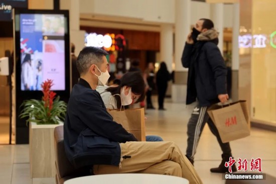 图为在加拿大多伦多,戴着口罩的顾客在一家大型综合商场内休憩。 中新社记者 余瑞冬 摄