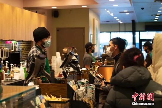 图为美国纽约市皇后区一家咖啡店人们戴口罩消费。 中新社记者 廖攀 摄