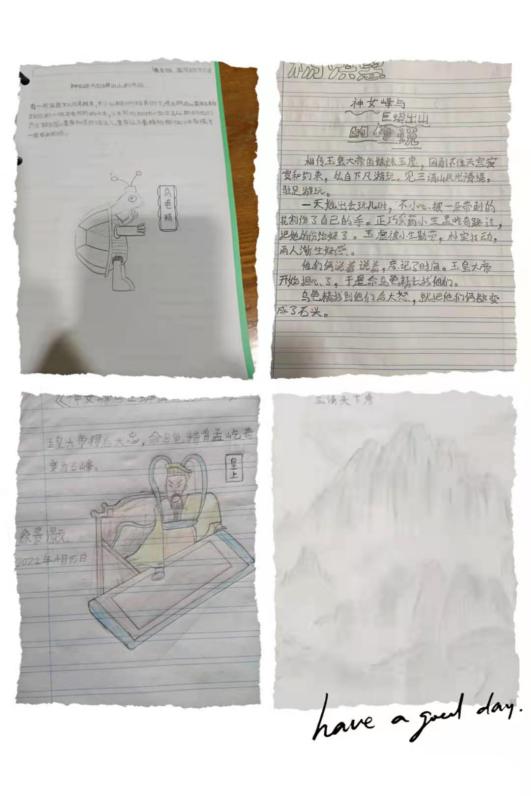 小营员们踊跃画出神话故事、书写神话故事、讲述神话故事。