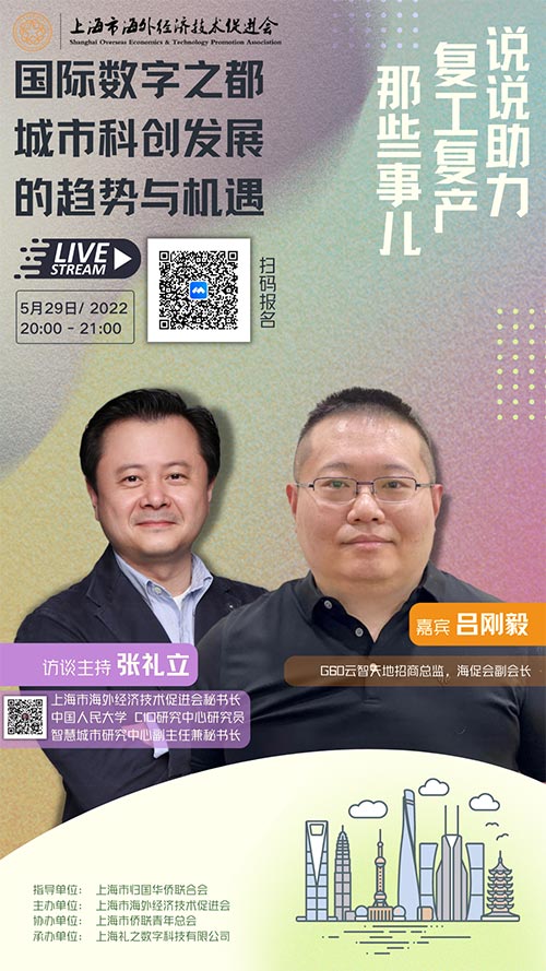 5月29日晚,由上海市侨联指导、上海市海外经济技术促进会主办、上海市侨联青年总会协办、上海礼之数字科技有限公司承办的“说说助力复工复产那些事”企业访谈系列视频讲座第七场暨“国际数字之都城市科创发展的趋势与机遇”成功举办,本期的访谈嘉宾为G60云智天地招商总监、海促会副会长吕刚毅,访谈主持人为上海市海外经济技术促进会秘书长张礼立博士,线上约340余位社会各界人士以视频方式听取了本次视频讲座。