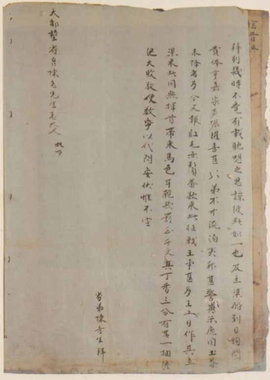 拜别几时,不觉有载,驰想之思,谅彼此如一也。及立渠船到日询问,贵体亨嘉、家声振耀,喜甚。弟不才,流泊夷邦,甚警。行(?)其米鹿国,土番未降者多,今又报红毛赤须番欲来此征战,王事甚多,王工日作,其立渠来此,因无挥首,带来马色耳匏,欲罚身千文,其丁香,三分有其一抽,经纪大败。敬便数字,以代问安,伏惟不宣。