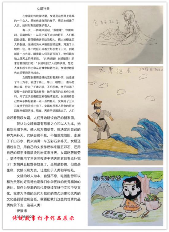 本期广东营活动精心挑选了中国传统生肖故事、女娲补天、大禹治水、仓颉造字、曹冲称象、先锋人物屠呦呦、古典诗歌等故事供营员们收听。在这些故事的熏陶下,营员们脑洞大开,提交了图文、视频或语音等形式多样的打卡作业。大家说,好故事让他们充分体会到中国故事的传奇色彩、感受到东方智慧的独特魅力。美国营员伊澳博说,通过听中国传统故事,让自己更加了解中国历史和文化,自己特别喜欢女娲补天的故事,因为它体现了中华民族以人为本、自强不息的精神,先锋人物屠呦呦的故事则让自己了解到,青蒿素的发现是中国对世界做出的巨大贡献,为自己是一名华裔少年而感到骄傲。梅曦同学在文字打卡中写到,今后如果遇到困难也要像屠奶奶一样尽自己所能坚持下去,不轻言放弃。马与泽同学每天自觉听故事打卡,马与泽妈妈说,他对学中文的兴趣空前高涨。
