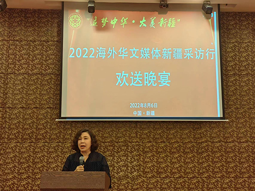 8月6日晚,在欢送晚宴上,新疆维吾尔自治区侨联党组成员、副主席米海尔古丽·阿吉表示,“7天的行程,采访团的各位老师们每走一地、每看一物、每听一事都积极宣传,为新疆传播了正面声音,进一步助力讲好中国新疆故事,为建设团结和谐、繁荣富裕、文明进步、安居乐业、生态良好的美好新疆贡献了侨界力量。”
