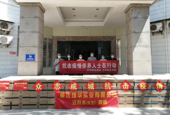 重庆市侨联兼职副主席汪瓦水时刻关注疫情形势,积极响应号召,定向捐赠10万元现金;重庆市侨青会常务副会长黄威林代表相关侨企捐赠3万元抗疫物资;沙坪坝区侨青会副会长呙坤宏代表相关侨企捐赠一批矿泉水;中国华侨公益基金会分别向沙坪坝区、合川区捐赠了250件、186件麦片……一笔笔款项、一件件物资迅速到达土主街道、南津街街道等基层一线,及时传递了侨界对抗疫一线工作者的感谢,对疫情防控的全力支持。