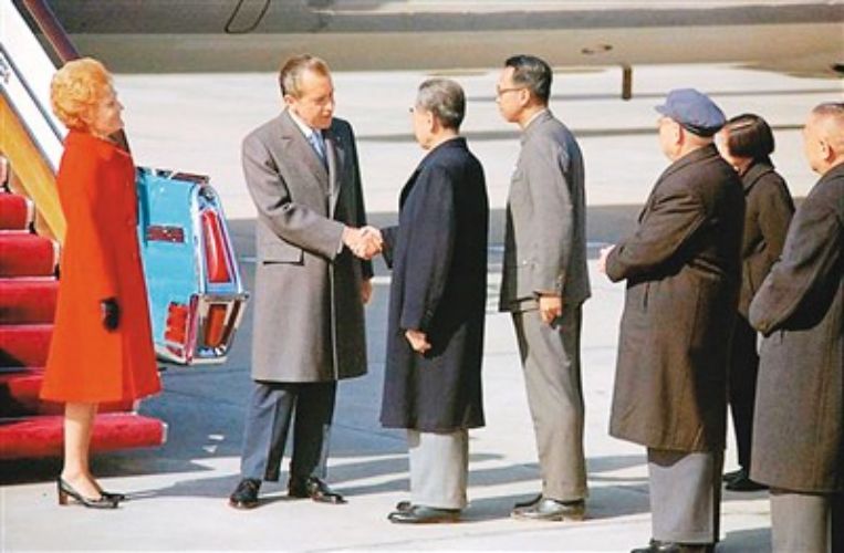 1972年,美国总统尼克松访华,周恩来总理到机场迎接,冀朝铸(左四)担任翻译。