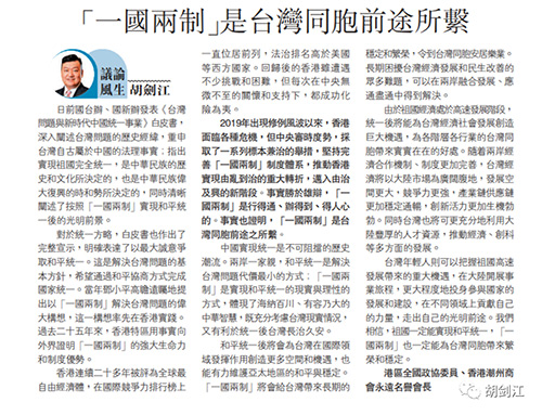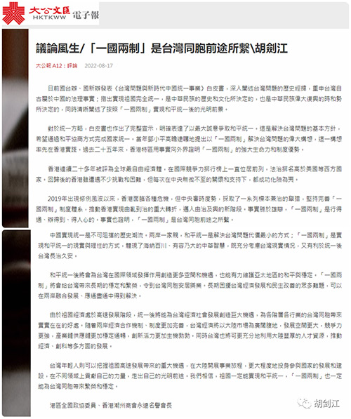 8月17出版的大公报A12版本刊登港区全国政协委员、香港潮州商会永远名誉会长胡剑江专题文章《“一国两制”是台湾同胞前途所系》,解读日前国台办、国新办发表的《台湾问题与新时代中国统一事业》白皮书精神,凝聚爱国正能量。