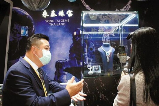 2021年11月5日—10日,李嘉淳会长的企业永泰珠宝集团第四次前往上海参加中国国际进口博览会。图为李嘉淳会长正在向人民日报社海外版记者介绍公司代表产品。