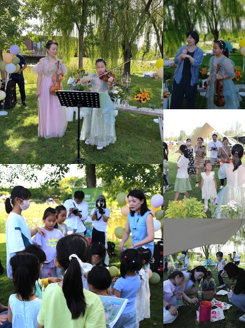 金秋九月,天气正好,家长和孩子们齐聚新萌芽,在户外亲近自然,创造美。宋洋老师和学生开场,小提琴演奏和歌名竞猜将现场气氛充分带动起来。小朋友们伴随着音乐合唱着《我的祖国》、《孤勇者》、《茉莉花》等,现场一片欢笑。