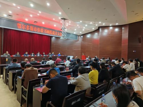 在成立大会上,简尔戎副主席作了《鄂尔多斯市侨联书画院成立大会筹备情况汇报》,与会人员通过了鄂尔多斯市侨联书画院《章程》(草案),选举产生了第一届理事会成员,聘请了顾问,大家纷纷表示将不遗余力辅助书画院开展的各项工作。“书画院要发挥书画艺术在塑造人的心灵、陶冶人的情操、构建和谐社会中的重要作用,积极开展书画艺术进社区、进学校、进企业、进家庭等活动。”市侨联党组书记、主席胡日嘎表示,并采取“走出去、请进来”的方式,大力加强与国内外书画界人士的团结和联谊,切实把书画家们的爱国爱乡热情和艺术才情引导到创作书画精品,服务文化建设上来,大力宣传和弘扬剪纸、雕刻、少数民族书法等其它非物质文化传承项目,不断选优推优。新当选书画院院长的周本刚坦言,侨联书画院将以书画艺术为纽带,以团结联谊海内外侨胞为目的,致力于海内外文化艺术交流与合作,弘扬中华优秀文化,传播鄂尔多斯地域文化,努力为推进“法治鄂尔多斯、健康鄂尔多斯、美丽鄂尔多斯”的建设作出贡献。会议期间还举行了揭牌仪式,胡日嘎主席与周本刚院长共同揭牌。